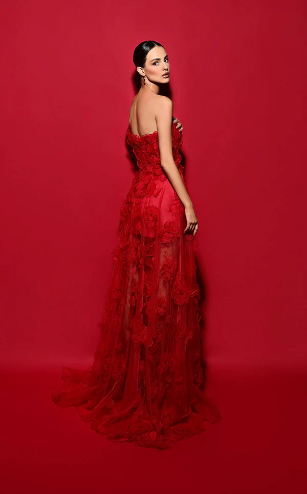 The Tarike Edize dress is a masterpiece of elegance and sophistication. Its strapless sweetheart neckline beautifully highlights the décolletage, while intricate handcrafted 3D floral appliques embellish the corset bodice, offering a stunning visual appeal. The classic A-line silhouette flows gracefully, enhancing every curve for a timeless look. Adding allure, a bold thigh-high slit infuses the design with sensuality, empowering the wearer to move with confidence and poise.